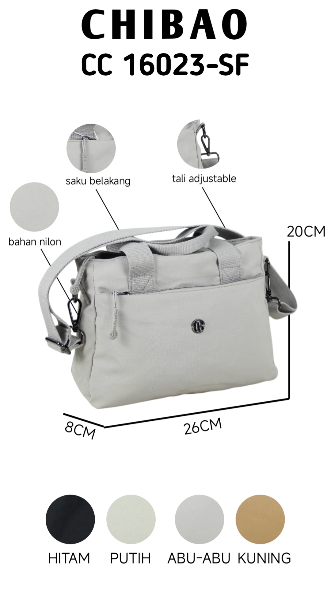 Quick View Chibao, Tas Selempang Selempang Remaja Chibao 16023-Sf Bahan : Nilon Ukuran : 26 x 8 x 20 Warna : Putih, Abu, Kuning, Hitam Rp118.000 Tambah ke keranjang Add to wishlist Add To Compare Quick View